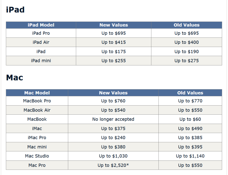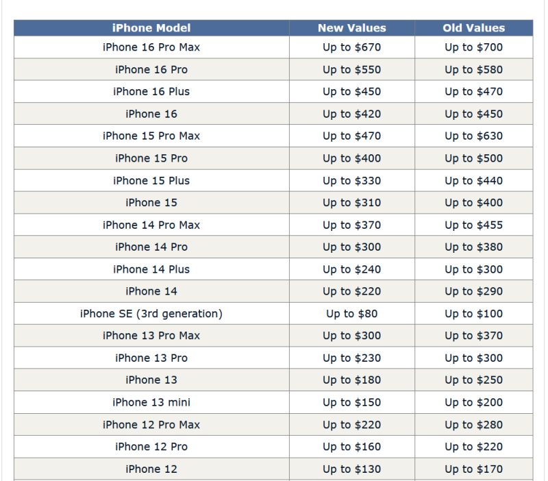 Как сообщает MacRumors, Apple скорректировала максимальную стоимость обмена для большинства устройств, снизив цены в среднем примерно на 20 %, за несколькими исключениями.