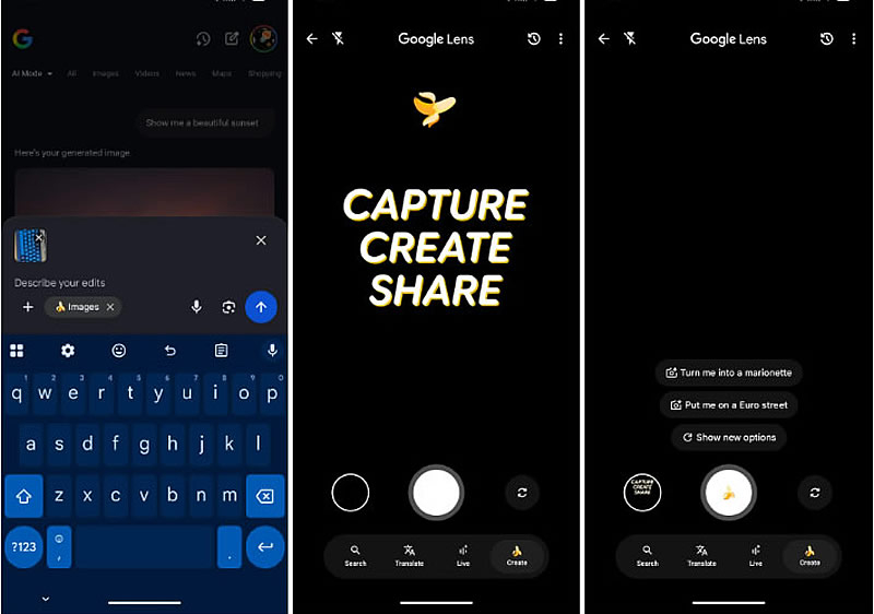 Более заметная интеграция Nano Banana реализована в «Google Объектив». После недавнего добавления функции Live в Поиск и переноса фильтра «Домашнее задание» непосредственно в интерфейс Поиска, в Lens появилась новая вкладка Create. Небольшое изменение дизайна переместило текстовые подписи под иконки, чтобы разместить больше фильтров горизонтально. Эта вкладка предлагает пользователям «снимать, создавать и делиться», причём кнопка спуска затвора отмечена эмодзи банана. В отличие от других фильтров, функция Create по умолчанию использует фронтальную камеру для селфи, но позволяет переключиться на основную камеру с помощью переключателя справа. Сделанный снимок автоматически добавляется в поле ввода AI Mode, где можно ввести текстовый запрос для редактирования или генерации.