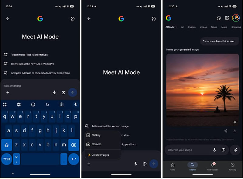 В режиме AI Mode в поиске Google появился новый значок «плюс» в левом нижнем углу поля ввода запроса, а функции голосового ввода и «Google Объектив» переместились в правую часть интерфейса. На этой же странице карусель с предложениями была заменена на упрощённый список подсказок. Через новое меню пользователи получают доступ к галерее, камере и функции создания изображений, обозначенной эмодзи банана. При выборе последнего варианта подсказка в поле ввода меняется на «Опишите ваше изображение», что позволяет генерировать новые изображения или редактировать загруженные. Все сгенерированные изображения содержат водяной знак Gemini в виде искры в правом нижнем углу и могут быть скачаны или отправлены другим пользователям.