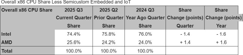В третьем квартале, по данным источника, доля AMD на рынке x86-совместимых процессоров без учёта встраиваемых решений и Интернета вещей продолжала расти. Если за год до этого она составляла 24 %, то к прошлому кварталу увеличилась до 25,6 %. Примечательно, что во втором квартале текущего года данный показатель не превышал 24,2 %. То есть, 1,4 процентных пункта процессоры AMD прибавили всего за один квартал.