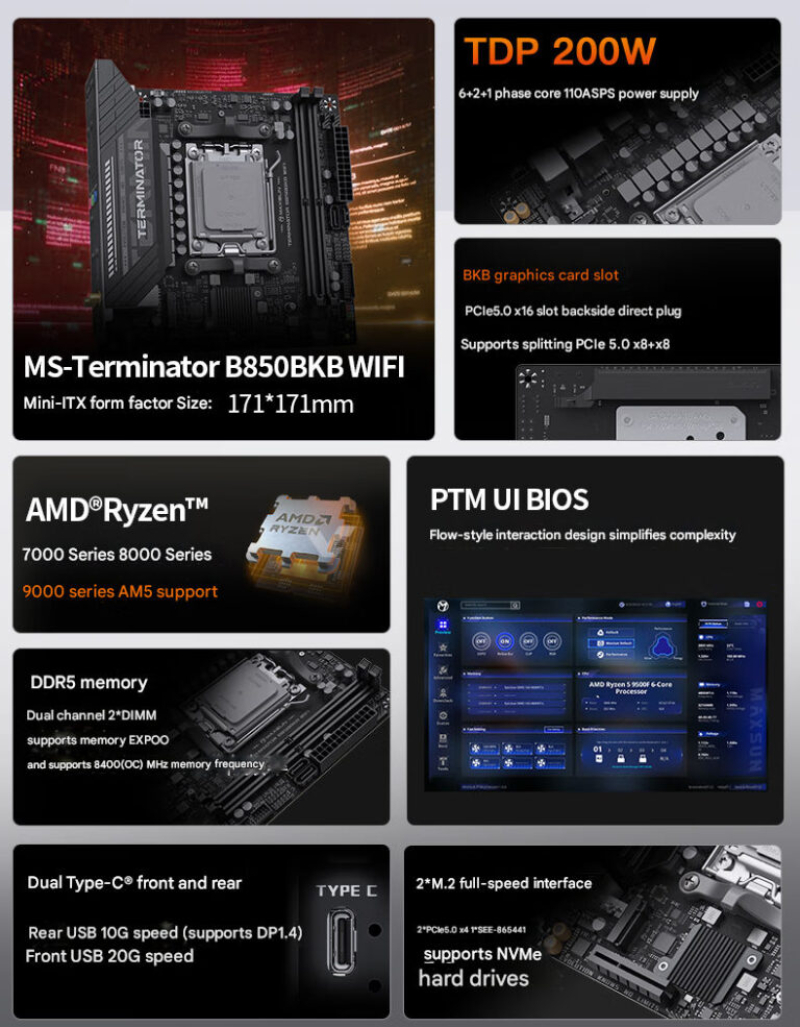 Размеры платы составляют 171 × 171 мм. В её основе используется 9-фазная подсистема питания VRM со схемой фаз 6+2+1. Каждая фаза рассчитана на силу тока 110 А. Основной и единственный слот PCIe 5.0 x16 — с поддержкой разделения с поддержкой разделения x8/x8. Вторичный PCIe 4.0 x4 расположен спереди, что редкость для такого формата плат. Также предусмотрены два слота под NVMe-накопители — один спереди, другой сзади, оба стандарта PCIe 4.0. MS-Terminator B850 BKB WiFi оснащена двумя разъёмами DIMM для памяти DDR5 с поддержкой установки до 96 Гбайт ОЗУ.