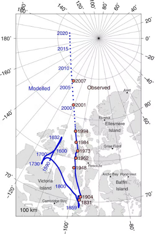 Естественные процессы в недрах Земли заставляют магнитный полюс блуждать «вокруг да около» истинного полюса планеты — точки, через которую проходит её ось вращения. Около ста лет назад магнитный полюс вдруг перестал мигрировать по северной части Канады и стремительно направился в сторону сибирской части России. Только за последний год магнитный полюс приблизился к нашей стране на 30–40 км и не собирается останавливаться на достигнутом.